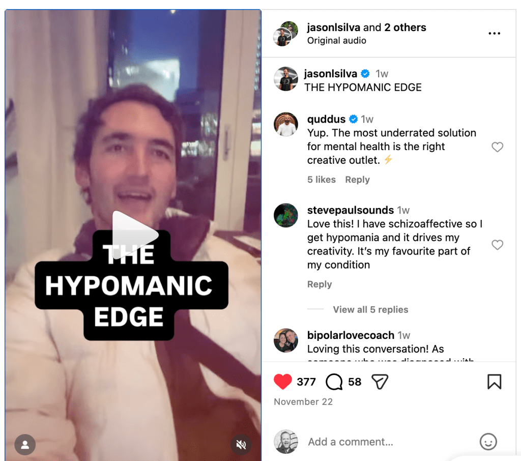 –Jason Silva posted an Instagram Reel this week discussing hypomania, a state of elevated mood, high energy, and accelerated thinking. He says it can be a key ingredient in creative and entrepreneurial achievement.
